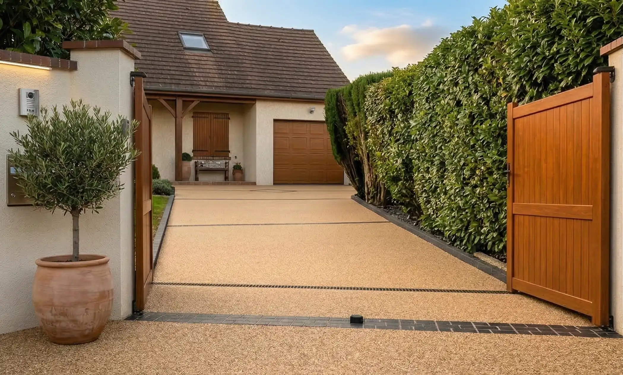 Décaissement important (25 cm), apport de grave spéciale, structure drainante, conformité PLU.
