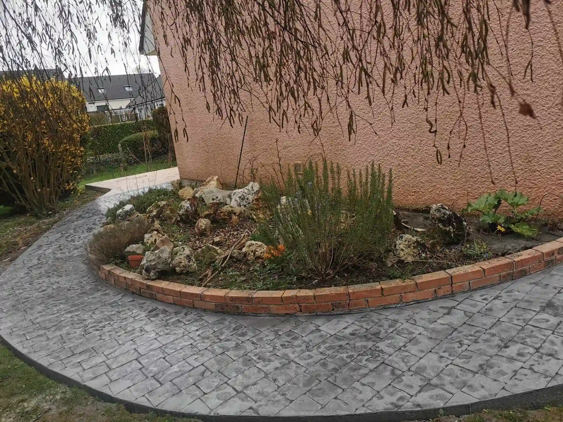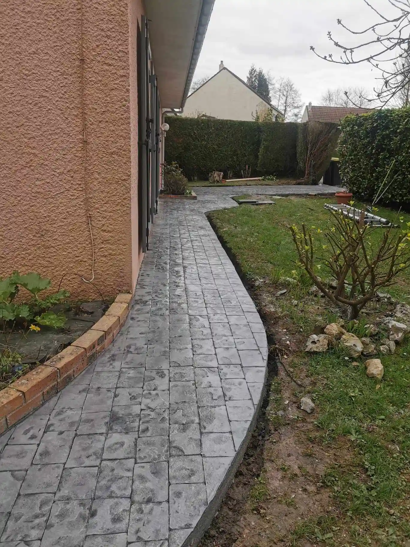 Allée piétonne et contour de maison en béton imprimé, 120m². Épaisseur dalle de 10 et 15 cm selon les zones.