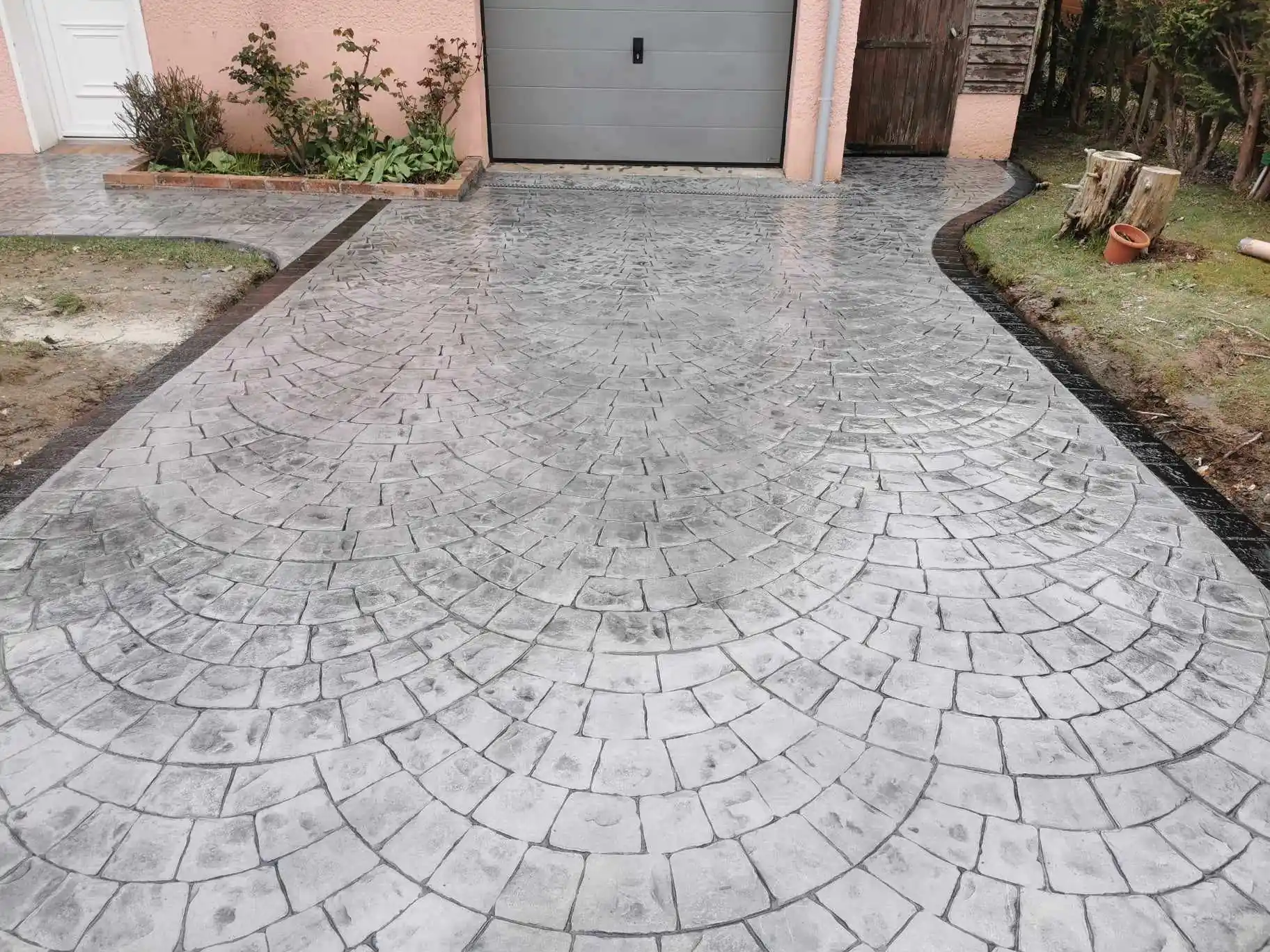 Béton imprimé avec matrice pierre naturelle et pavés "queue de paon", teinte gris clair pour un rendu élégant et moderne. L'impression homogène sur toute la surface crée une continuité visuelle qui unifie les différents espaces. Finition vernis antidérapant pour garantir la sécurité sur l'allée et la terrasse.