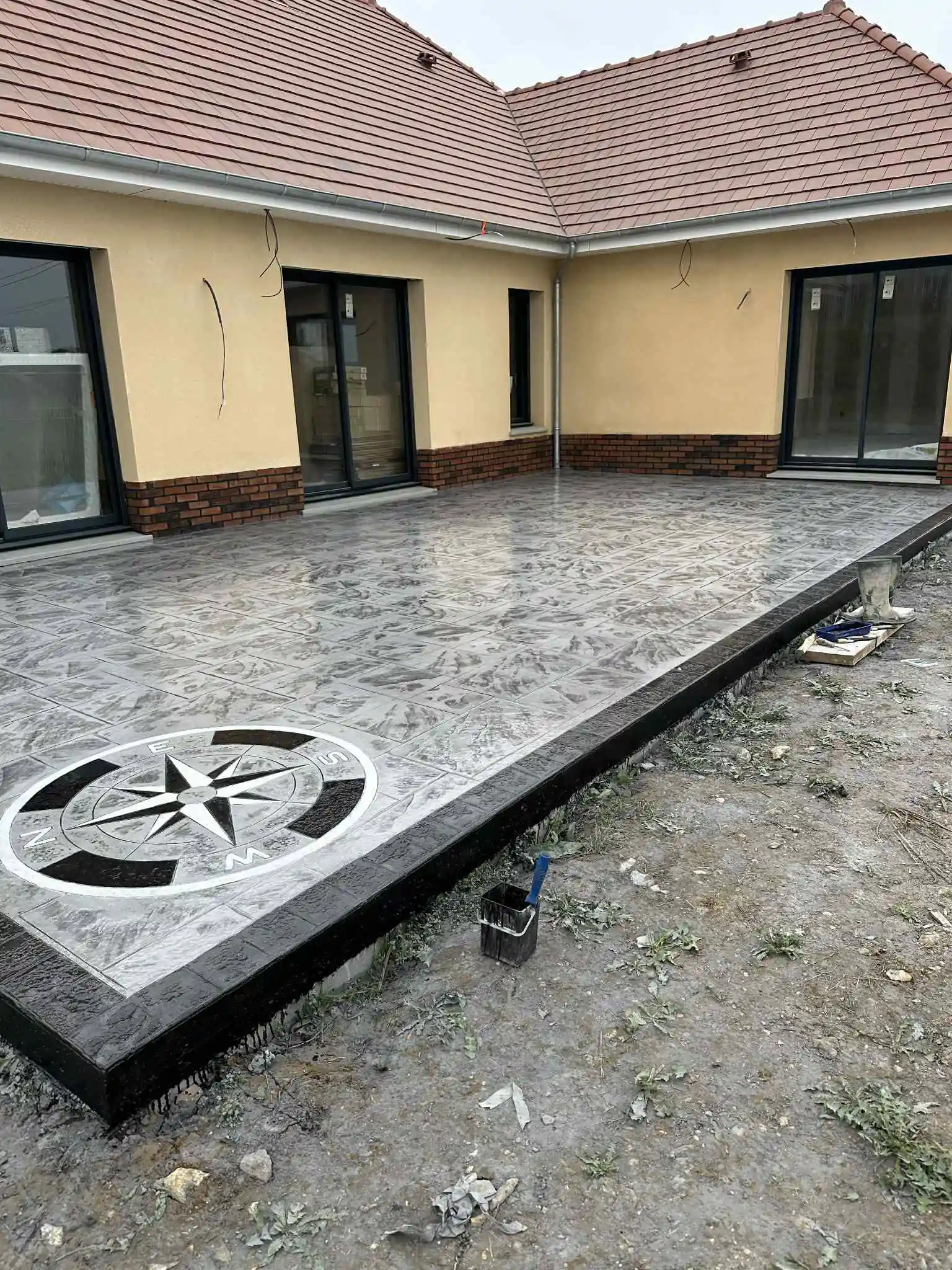 Terrasse en béton imprimé motif travertin pour une maison individuelle.