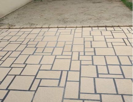 Création d'allées piétonnes et d'une terrasse en béton matricé à Poissy (Yvelines) sur dalle béton existante mais avec retrait de l'ancien support de surface qui était dégradé. La dalle béton était en très bon état général, ce qui est la condition sinéquanone pour y appliquer le béton matricé. Le client recherchait une solution esthétique avec effet pierre naturelle et suffisamment robuste pour un usage régulier et sur le long terme.