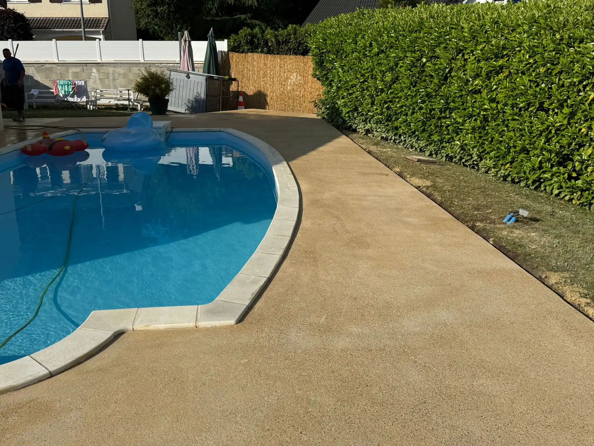 Nous avons sélectionné le béton stabilisé "Saharo" de la marque Lafarge, reconnu pour sa qualité et son rendu naturel. La teinte "ton pierre" a été choisie pour apporter chaleur et luminosité aux abords de la piscine.