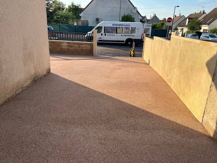 Béton désactivé teinté avec un dosage de 10 kg de pigments par m³ de béton. Un échantillon a été réalisé au préalable auprès de la centrale et validé par le client avant le coulage de l'ensemble de la surface.