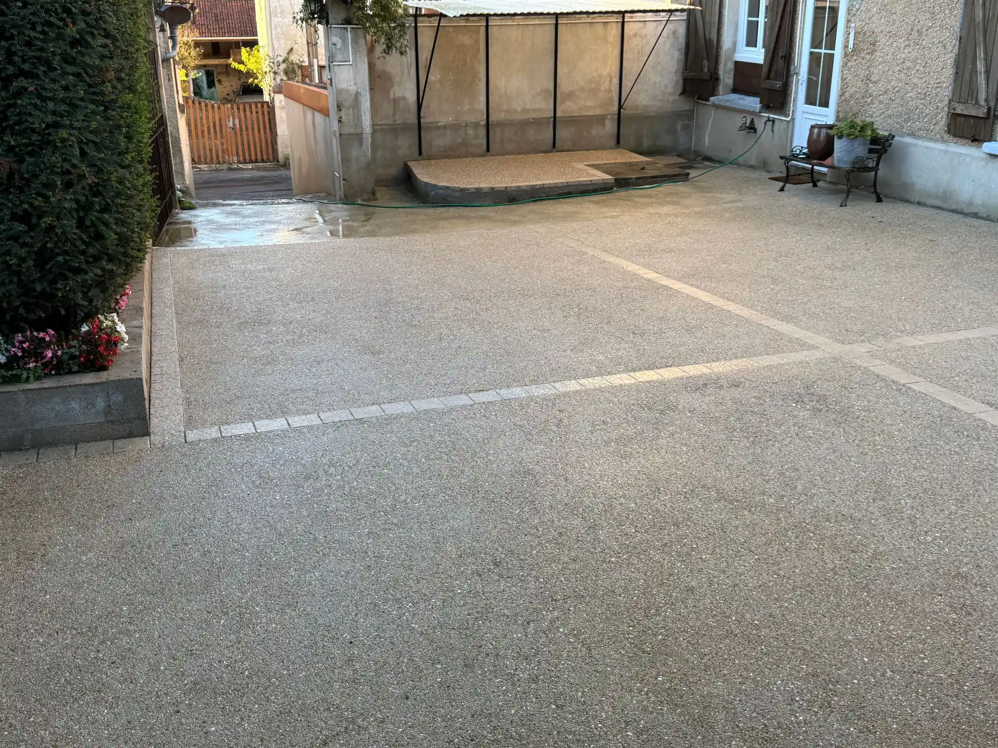 Création d'un parking de 110 m² en béton désactivé avec option lignes de pavés à Fontenay-Trésigny (Seine et Marne). Le client souhaitait un espace de stationnement structuré visuellement tout en conservant la praticité et la durabilité du béton désactivé.